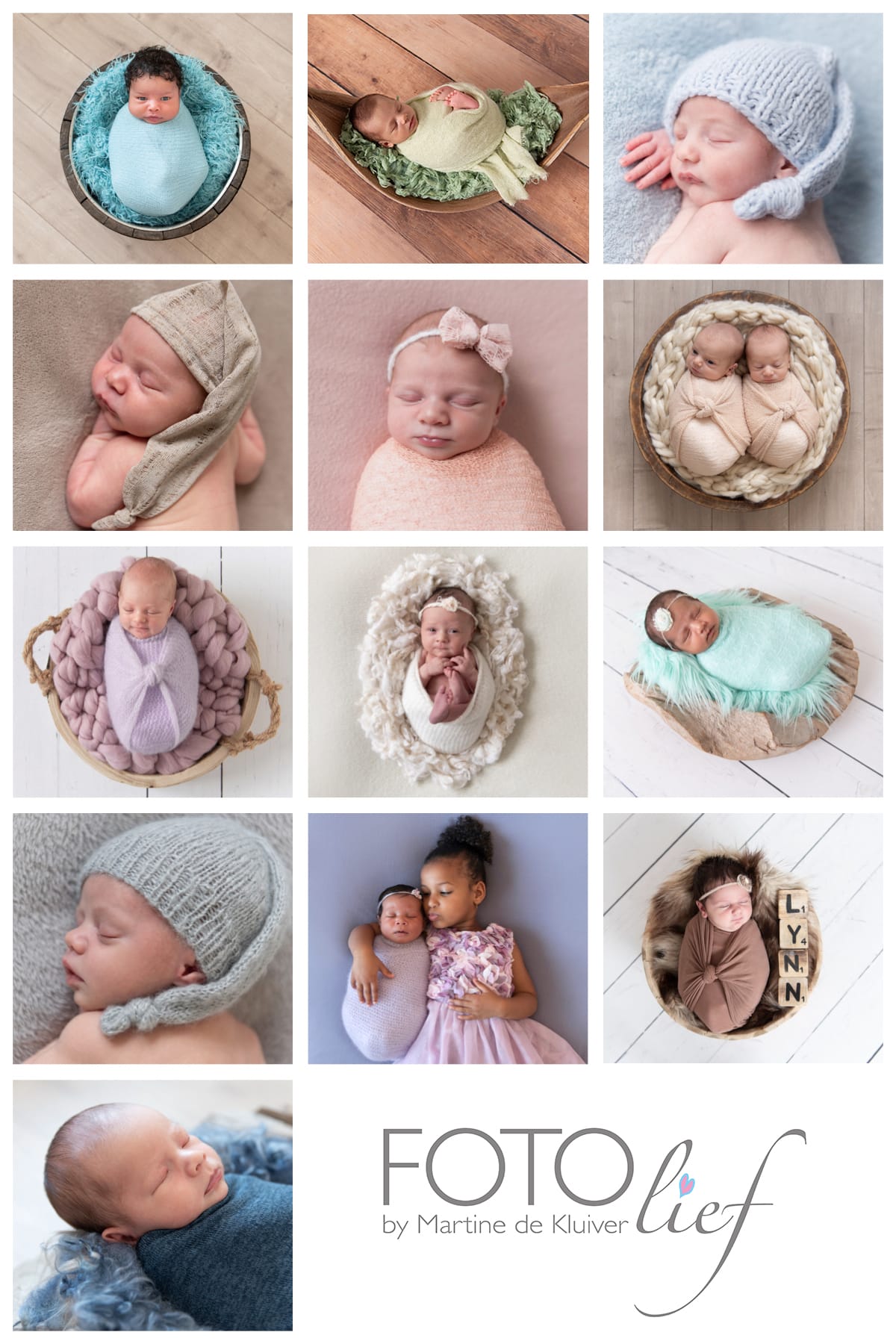 Props die ik gebruik bij een geposeerde newbornshootBij een geposeerde newbornshoot in mijn studio in Barendrecht kun je ter plekke kiezen welke spullen ik voor de foto’s van je newborn ga gebruiken. Ik maak foto’s van je baby op de beanbag en in één of twee props. In onderstaande collages zie je welke newbornprops en kleuren je kunt kiezen. Bij alle kleuren heb ik matchende mutsjes en/of haarbandjes. Naast de foto’s van je baby, maak ik indien gewenst tussendoor ook foto’s met papa, mama en eventuele oudere broers of zussen.Meer weten over newbornfotografie? Zie de informatiepagina en het portfolio.Hou je niet van geposeerde newbornfoto’s, maar wil je wel graag foto’s als je baby nog zo klein is? Boek dan een lifestyle newbornshoot bij je thuis.Newbornprops bij FOTOliefNewbornkleuren bij FOTOlief